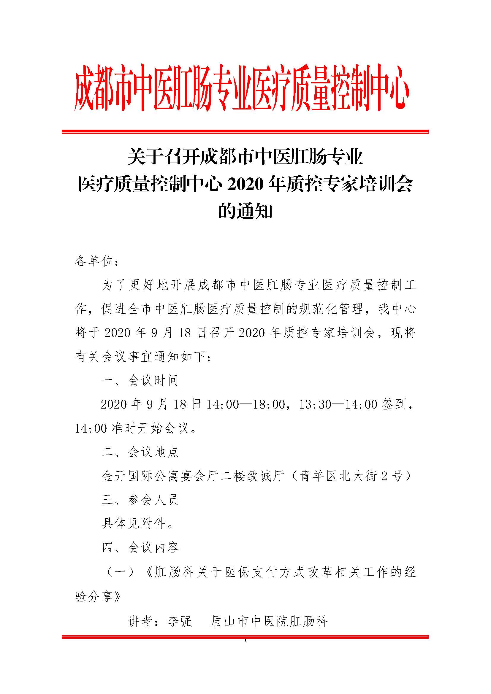 关于召开成都市中医肛肠专业质量控制中心2020年质控专家培训会的通知