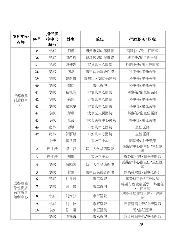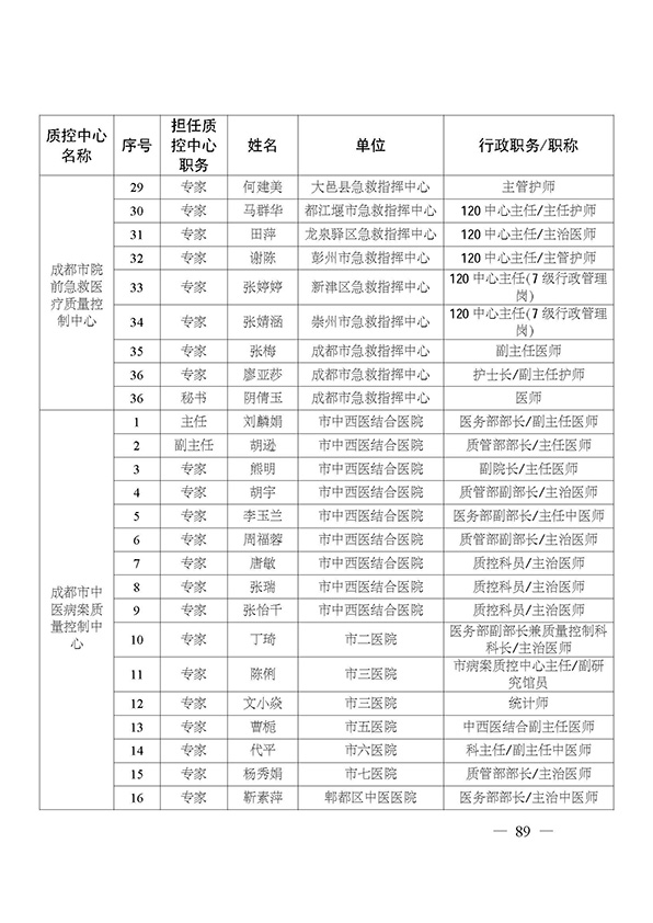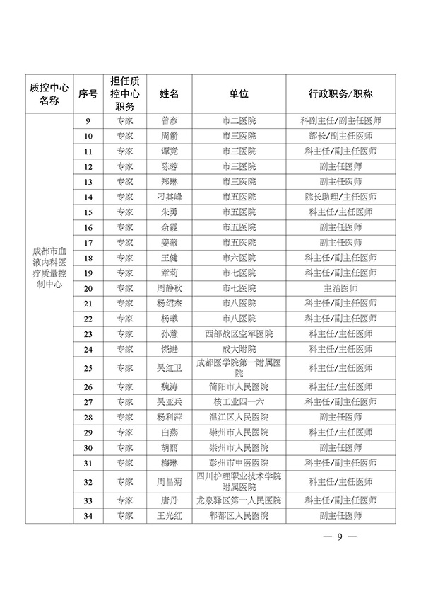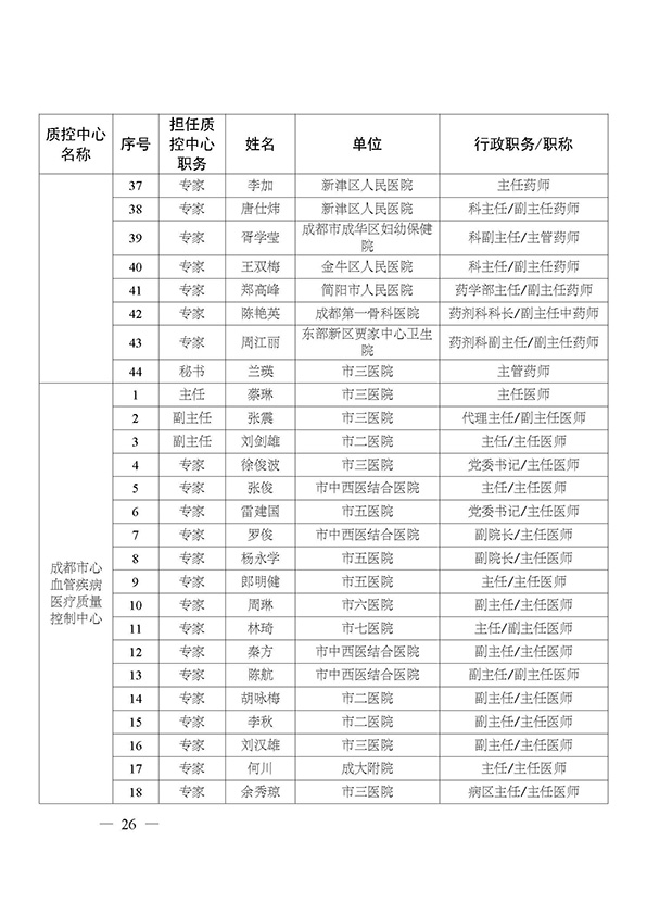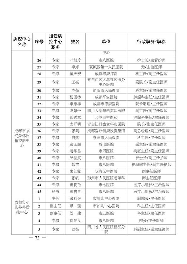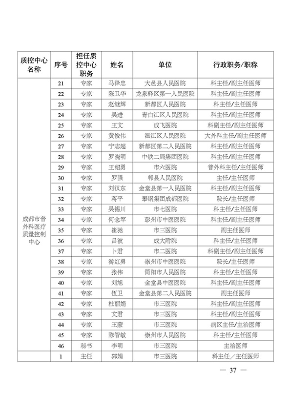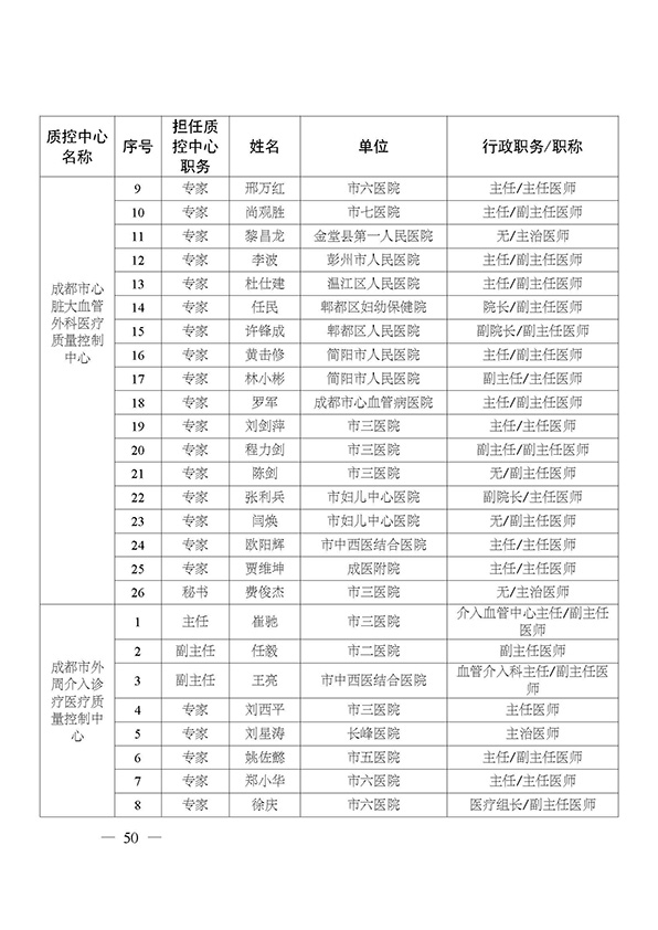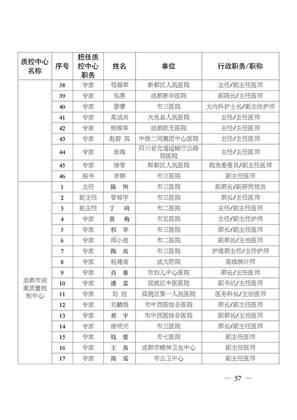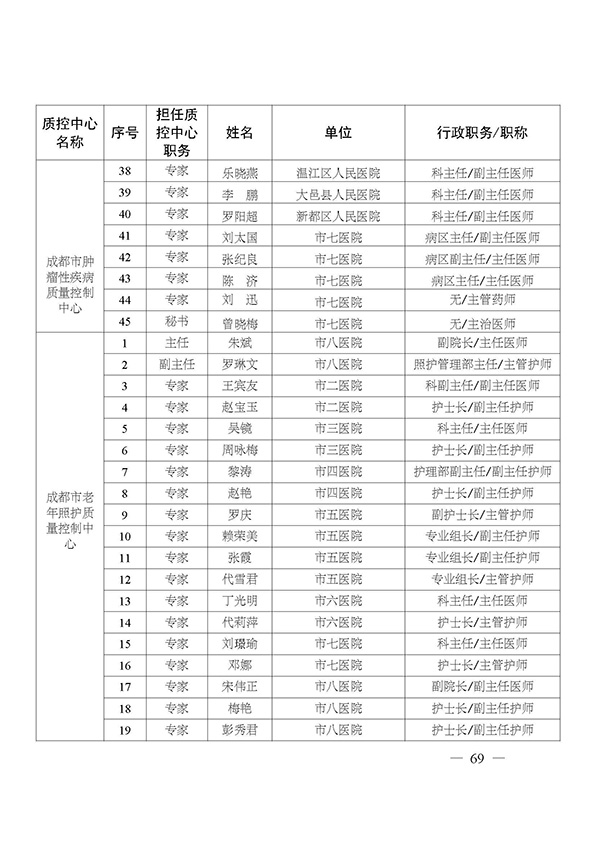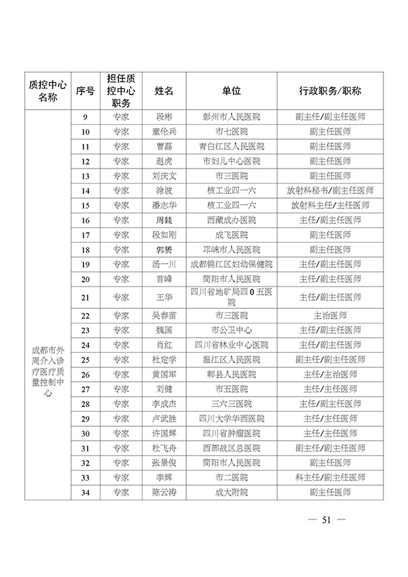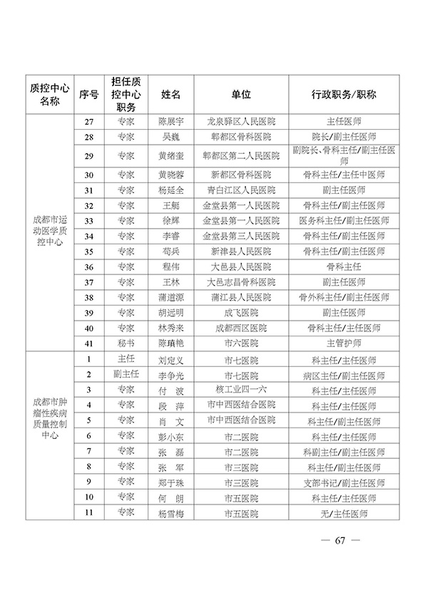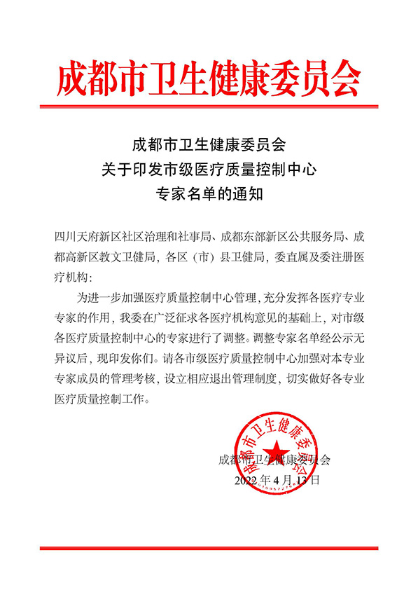 关于印发市级医疗质量控制中心专家名单的通知
