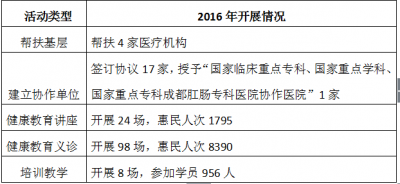 目前与我院建立协作关系并签订协议的医疗机构共计116家,其中授予42家医疗机构“国家临床重点专科、国家重点学科、国家重点专科成都肛肠专科医院协作医院”;于2016年签订了17家,分别是四川省中西医结合医院、成都市第三人民医院、成都泰兴医院、双流柏林医院、锦江区春熙社区卫生服务中心、乐山肛肠医院、犍为县中医医院、什邡市回澜镇卫生院、乐山唐氏肛肠专科医院、茂县人民医院、邻水县中医医院、崇州市街子缘生堂诊所、龙泉驿区柏合镇利生堂门诊部、锦江益民医院、锦江区成龙路社区卫生服务中心、成华青龙街道海滨湾社区卫生服务站、高新区中和社区卫生服务中心。授予了1家为什邡市回澜镇卫生院。