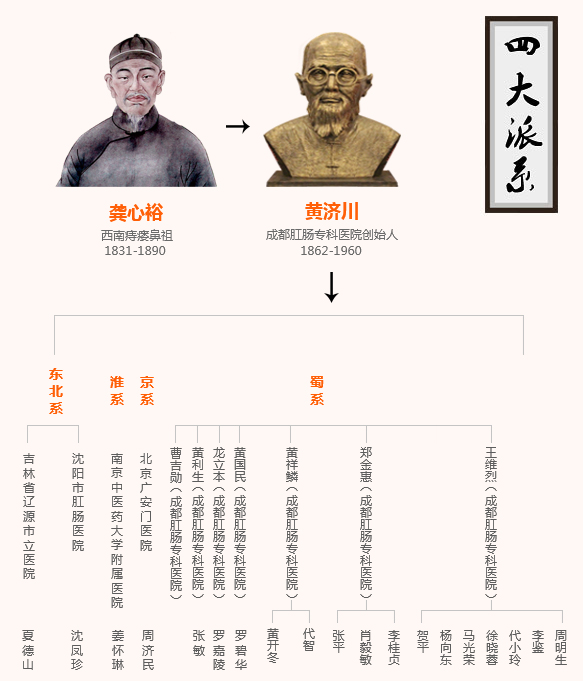 拥有174年发展史的成都肛肠专科医院,经历过灿烂的辉煌——经考证,长城内外,大江南北,全国70%的肛肠专科均由此传播出去,形成了巨大影响的龚心裕·黄济川胃肠医学学派,老先生及其继任者以开放式的无私传播,继而在祖国的长城内外、大江南北又形成了龚心裕·黄济川胃肠医学学派九大流派。早年,黄济川老先生直接、间接的参与了大量中共地下党的工作,他最得意的徒弟之一曾愉,曾是华东地区出色的地下工作者,著名影视剧《五十一号兵站》就有他的部分原型。在20世纪四、五十年代,黄济川同蒲辅周、杜自明、高敬舆并称“成都四大天王”。新中国成立后,黄济川曾担任四川省第一、二届人大代表、省政协委员、中国农工民主党四川省第一届省委委员,享受副省级待遇,配有专车。同杜自明、石筱山、赵炳南被誉为新中国“中医外科四大名医”;1956年95岁高龄时与“中国外科之父”裘法祖共同当选为第五届中华医学会外科学会副会长,获得了中医外科在我国医学史上最高的学术地位,至今前无古人后无来者。同年周恩来总理在北京亲自接见了黄济川,这张当时发表在《人民日报》的照片,也是国家中医药管理局成立后的十多年里入门大厅的唯一宣传图片;1960年黄济川老先生去世时国务院和四川省人民政府均送了挽联。