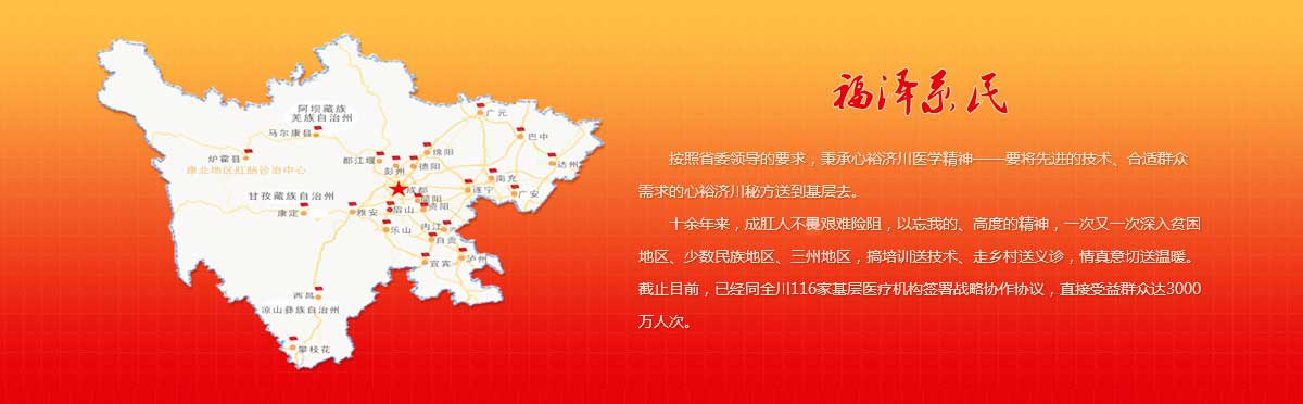成都肛肠专科医院始终保持济川医学大医精诚思想,坚持社会公益责任。早在2007年,医院就专门成立了疾病预防处,负责基层帮扶行动,组织专家小组,以义诊、学术讲座、技术培训、示范性手术演示等形式进行卫生学术下乡行动,足迹遍及三州民族地区、革命老区、盆州山区等。自2013年在甘孜州炉霍县援藏帮扶以来,成都肛肠专科医院积极探索卫生医疗援藏新模式,帮扶两年时间就让对方医院获得了省级重点专科的荣誉,并获得20万元的建设经费,取得的成绩得到了甘孜州政府及四川省卫健委的高度肯定。不仅在省内各区县如宜宾市中医医院、资中县人民医院、遂宁市安居区中医医院、大竹县中医院等成立专家工作室或专科联盟,深入到眉山市人民医院、遂宁市蓬溪县人民医院、资阳市中医医院、内江市中医医院、巴中市中医院等基层开展四川省中医强基层——百千万行动;还助力成渝地区双城经济圈建设,在重庆市璧山区中医院成立专家工作室;在重庆市南川区中医医院、重庆市綦江区人民医院也广泛开展川渝共携手、中医强基层百千万行动。